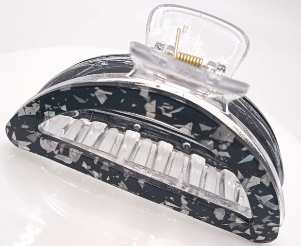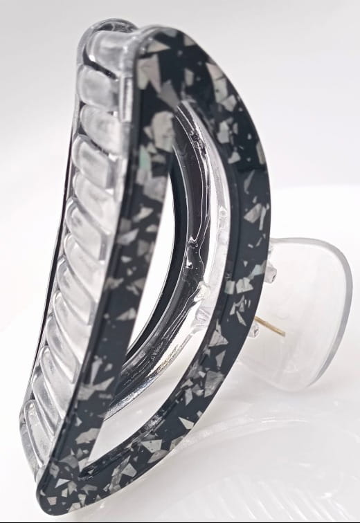 Ta czarno-srebrna klamra do włosów to praktyczna i stylowa ozdoba do codziennych i wieczorowych fryzur. Wykonana z przezroczystego, trwałego tworzywa z eleganckim czarno-srebrnym wykończeniem po bokach, doskonale nadaje się do podpięcia długich, gęstych włosów.