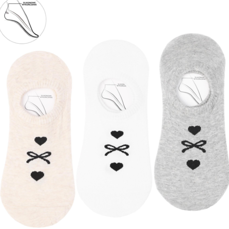 Stopki damskie 3-pak z serduszkiem i kokardką – beż, biel, szarość – rozmiar 38–41
