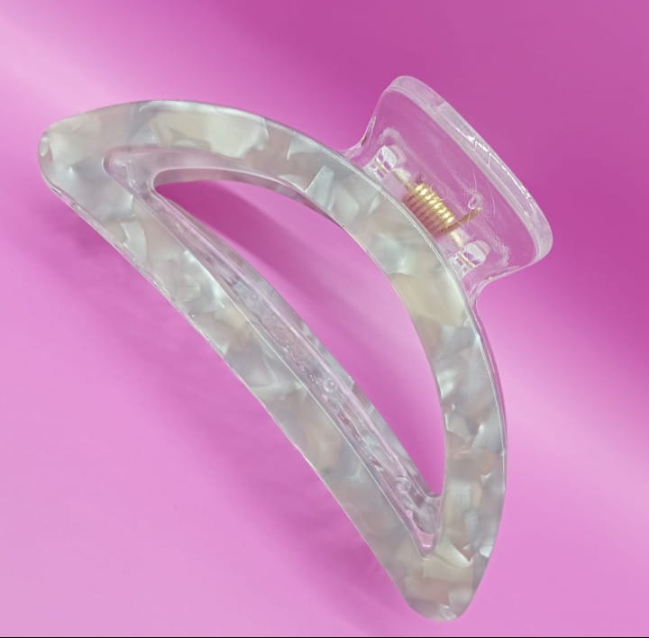 Przezroczysta klamra w odcieniu szarości łączy minimalizm z klasą. Jej subtelny połysk sprawia, że pięknie komponuje się z każdą stylizacją. Jest lekka, dobrze trzyma włosy i nie uszkadza ich struktury. Idealna do szybkich, ale estetycznych fryzur.