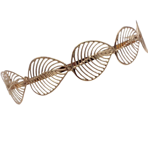 Złota opaska do włosów z ażurowymi listkami to wyjątkowy dodatek dla kobiet ceniących elegancję i subtelne zdobienia. Opaska wykonana z lekkiego, elastycznego metalu, który idealnie dopasowuje się do kształtu głowy, nie powodując ucisku i nie wyrywając włosów.