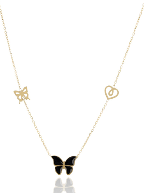 Złoty naszyjnik z czarnym motylkiem, ażurowym motylem i sercem – stal 316L